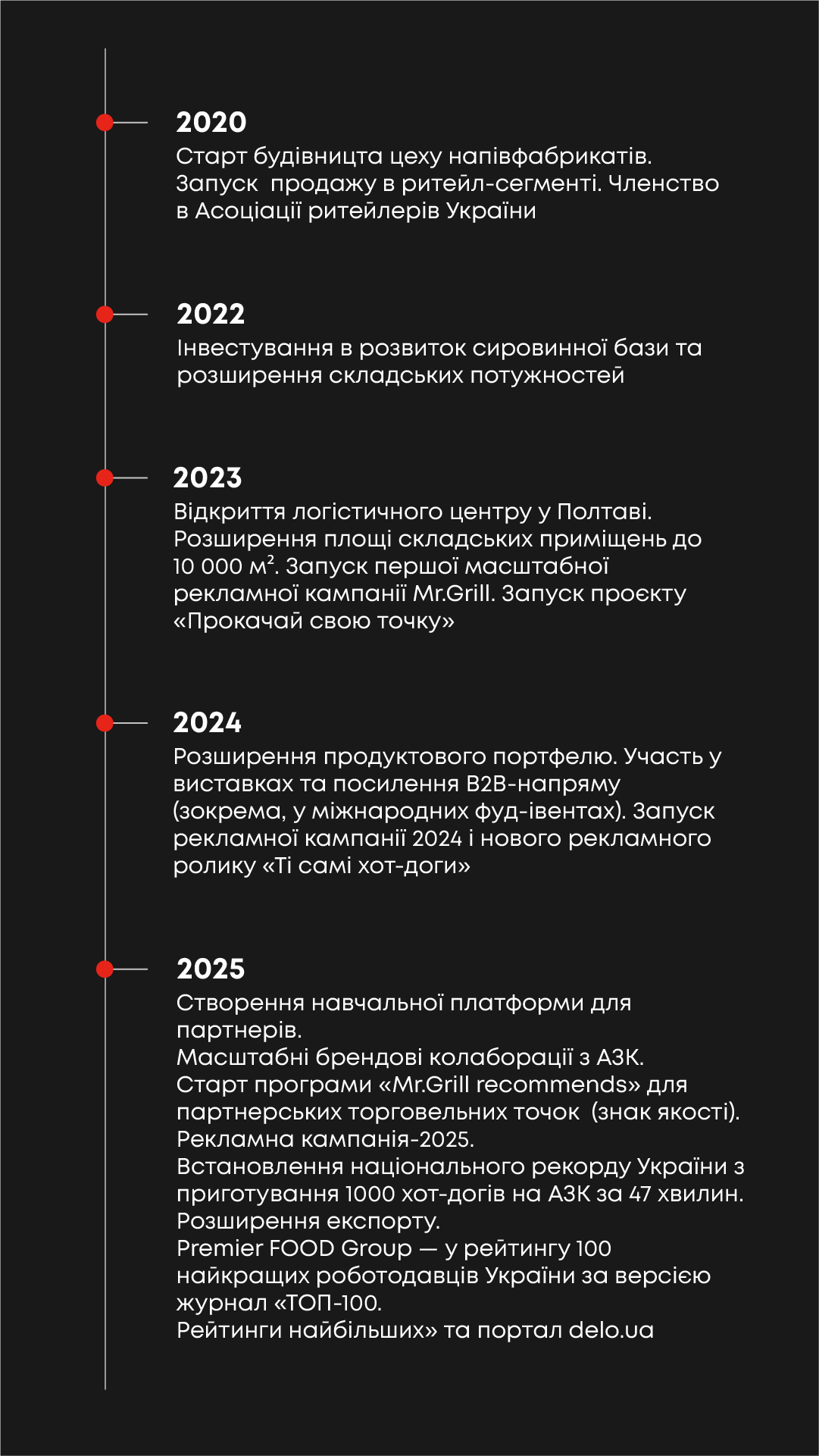 ” Сімнадцять років тому ніхто на ринку не вірив, що звичайний хот-дог для перекусу в дорозі може стати високоякісним продуктом у ресторанному сегменті. Premier FOOD змінив ставлення українців до хот-догів і тепер ми розвиваємо ще й культуру всього стритфуду. Сьогодні ми номер один на ринку food service та стритфуду.