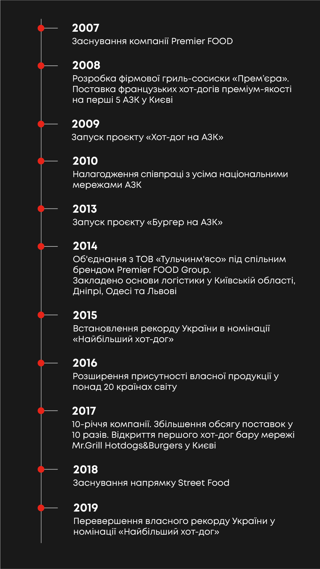 Premier FOOD Group була заснована у 2007 році. Вже за рік компанія представила власну розробку — сосиску «Прем’єра» — та здійснила перший продаж хот-догу на АЗК.